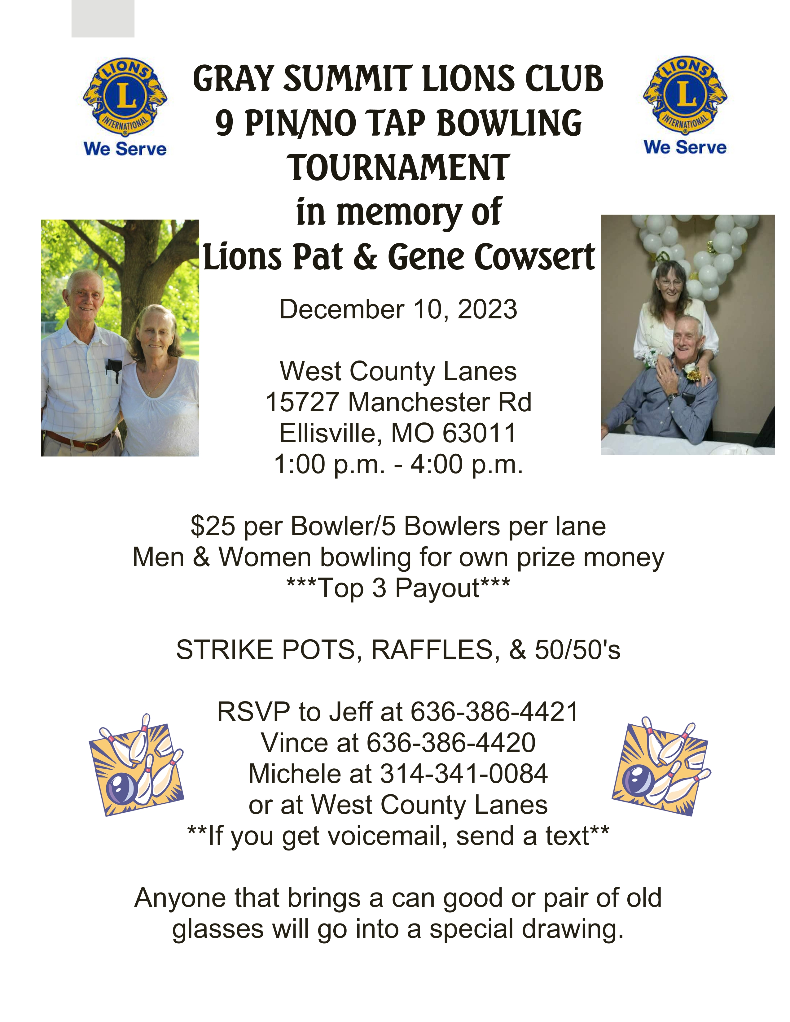 Gray Summit Lions Club 9 pin/No tap Bowling Tournament in memory of Lions Pat & Gene Cowsert. Location: West County Lanes, 16727 Manchester Rd, Ellisville, MO 63011. 1pm – 4pm. $25/bowler 5 bowlers/lane. Top 3 payout. RSVP to Lion Michele Obert 314-386-0084 or Lion Jeff Scherr 636-386-4421 or Lion Vince Sherr 616-386-4420.