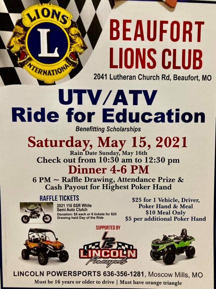 Beaufort Lions UTV Ride for Education (Poker Run and Scavenger Hunt) to benefit scholarship program @ Beaufort Lions Hall, 2041 Lutheran Church Rd, Beaufort, MO 63013. Registration 11:00 am – 1:00 pm. $25 for 1 vehicle, driver, poker hand and meal. $10meal only. $5 per additional poker hand. Riders only pay for poker hand and/or meal. Attendance prizes and cash payout for highest poker hand. Must be 16 years or older to drive. Must have orange triangle.
